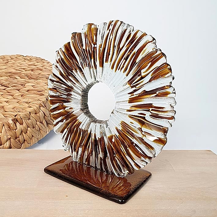 “Amber Ring” El Yapımı Sanat Objesi…Tamamen el yapımı olduğu için hiçbir eser bir değerine benzemez ve her bir ürün eşsizdir. Dekoratif cam masaüstü süsü 20 cm x 22 cm (h) ölçüsündedir. (El Yapımı olduğu için ölçülerde ufak farklılıklar olabilir.)
